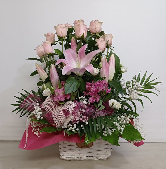 Cesta (modelo según existencias) con flor cortada en tonos suaves.